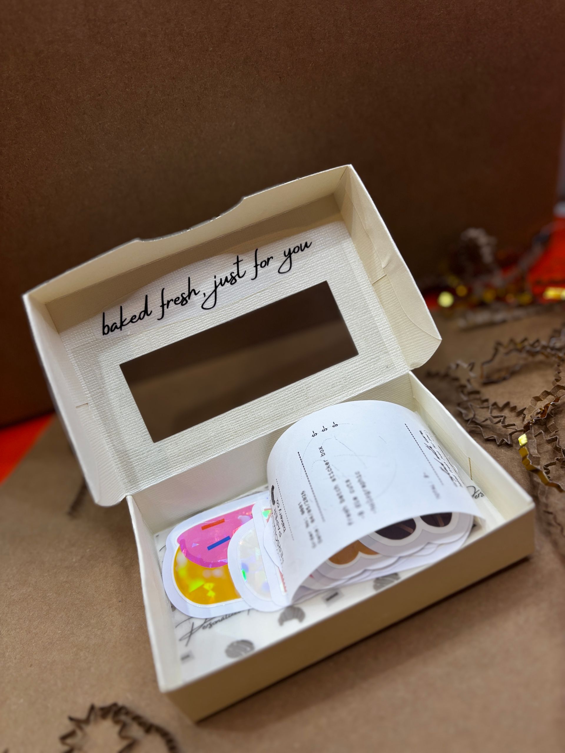 Freshly baked and packed with charm. The Fresh Batch Sticker Box includes an assortment of premium die cut stickers packaged in our signature bakery inspired mini donut box complete with a peek through window, custom bakery liner, and receipt-style insert.